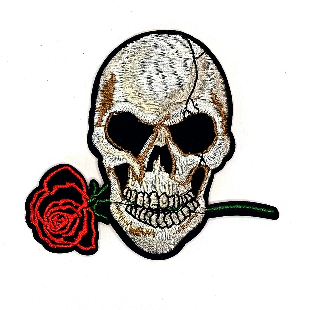 Романтика и мрак в едно – тази бродирана нашивка изобразява череп, захапал роза, символ на страст, спомен и вечност. Перфектна за якета, чанти или жилетки на хора, които носят стил със смисъл. 😎